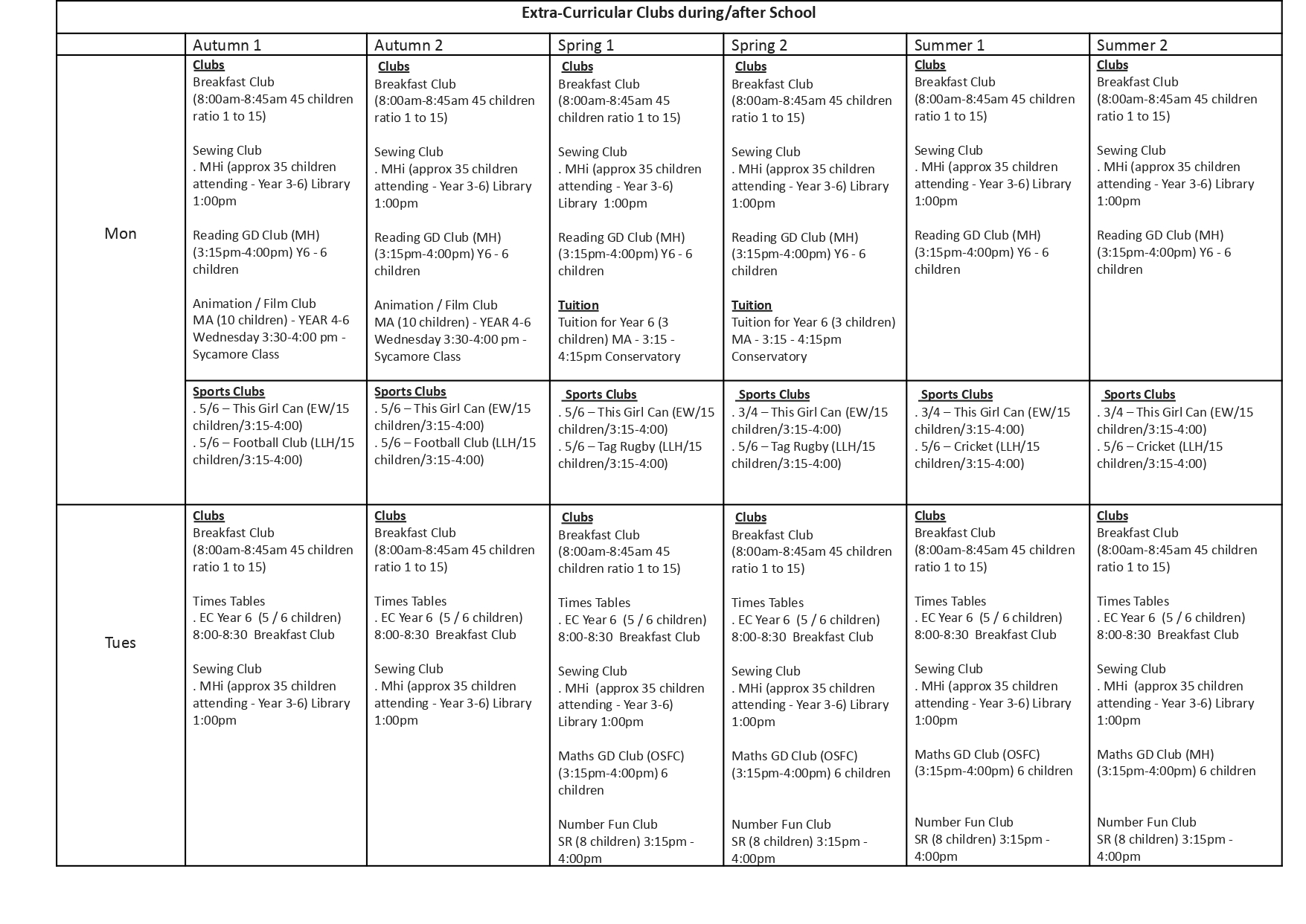 All clubs finish at 4.00 pm except for Gymnastics and Cricket which finish at 4.15 pm.