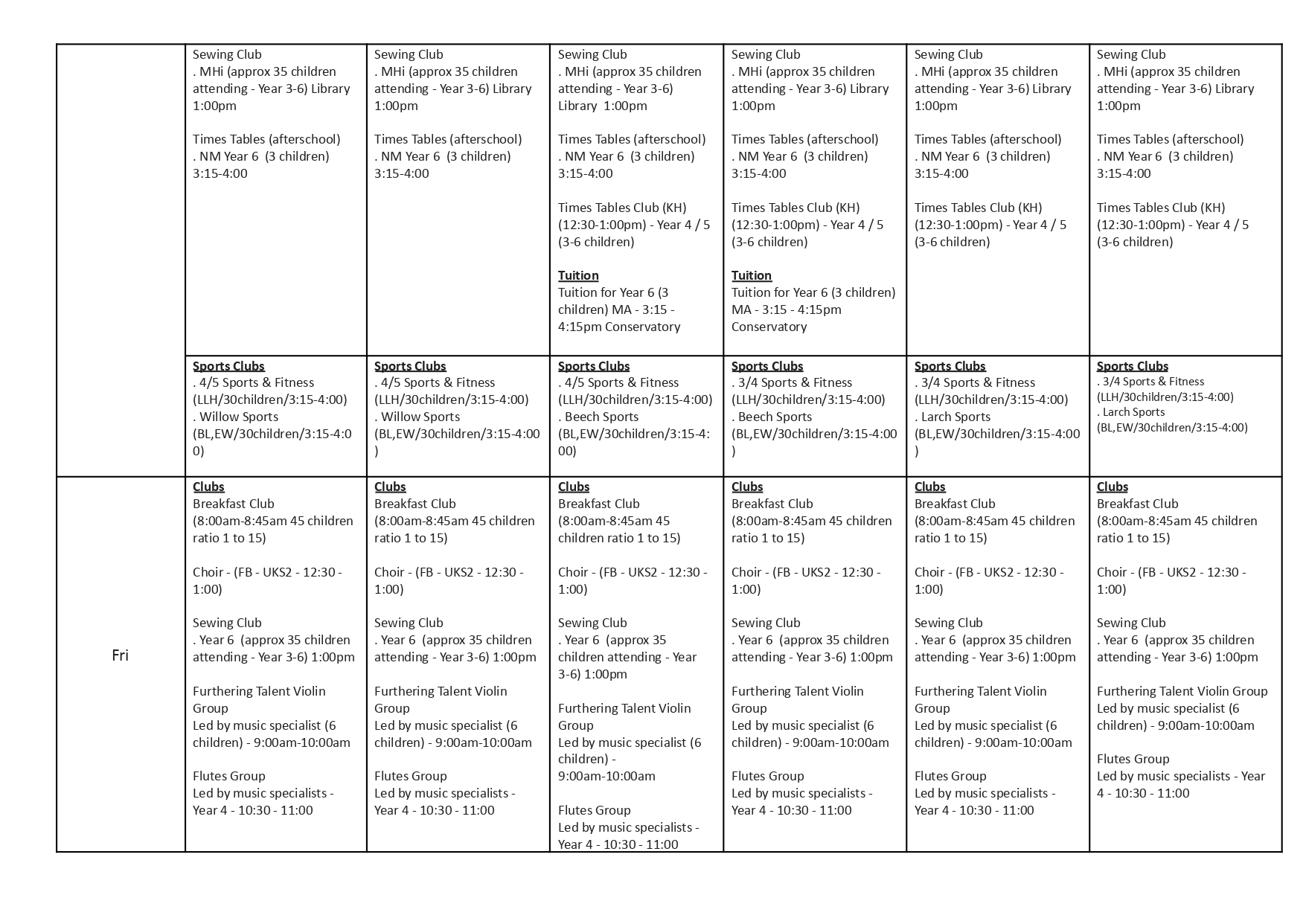 Please note, extra curricular activities may vary at different times of the year.