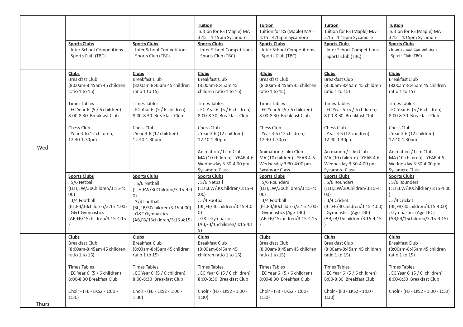 All clubs finish at 4.00 pm except for Gymnastics and Cricket which finish at 4.15 pm.
